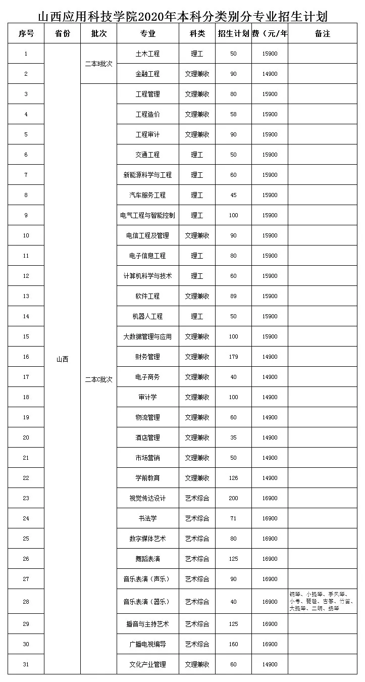 山西应用科技学院2020年普通本科分批次分专业招生计划